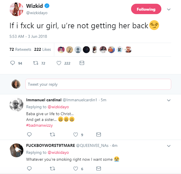 Starboy Wizzy has made it very clear that should he ever sleep with anyone’s woman, that man is never getting her back.