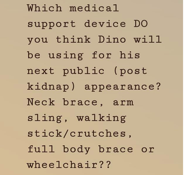 Following the news of Dino Melaye having been kidnapped, Toolz took to her IG to share a post asking which medical support device he would emerge wearing once he returns to the limelight.