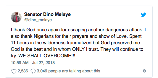 I thank God once again for escaping another dangerous attack. I also thank Nigerians for their prayers and show of Love. Spent 11 hours in the wilderness traumatized but God preserved me. God is the best and in whom ONLY I trust. They will continue to try. WE SHALL OVERCOME!!!