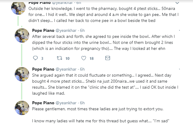 Viral Posts Read how a man’s girlfriend tried to dupe him with fake pregnancy By Emeh Achanga - 12/08/2018 0 Facebook Twitter Pinterest WhatsApp Linkedin A man has taken to Twitter to reveal how his girlfriend almost tricked him into giving out so much money with fake pregnancy. Read below; Emeh AchangaLike this:Like Loading... CLICK TO COMMENT