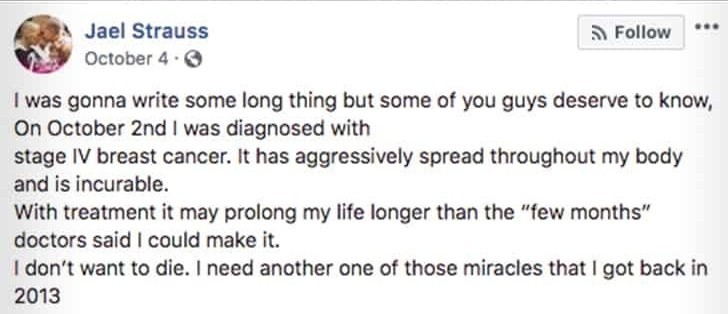 She had taken to Facebook in October to reveal she’d been diagnosed with incurable stage 4 breast cancer.