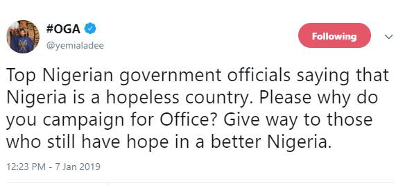 Yemi Alade took to Twitter; ‘top Nigerian government officials saying that Nigeria is a hopeless country. Please why do you campaign for Office? Give way to those who still have hope in a better Nigeria’.