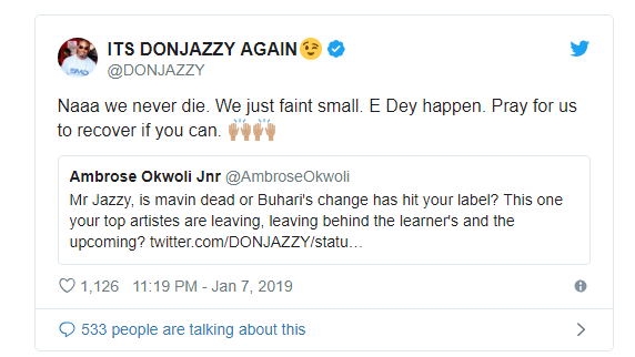 Don Jazzy then replied saying; ‘Naaa we never die. We just faint small. E Dey happen. Pray for us to recover if you can.’