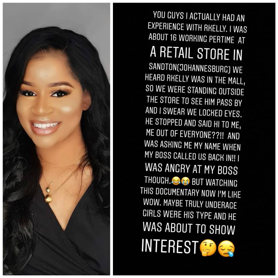 Former beauty queen IOhuoma Nnadi has shared her experience with singer R Kelly who is currently facing multiple sexual offence charges.