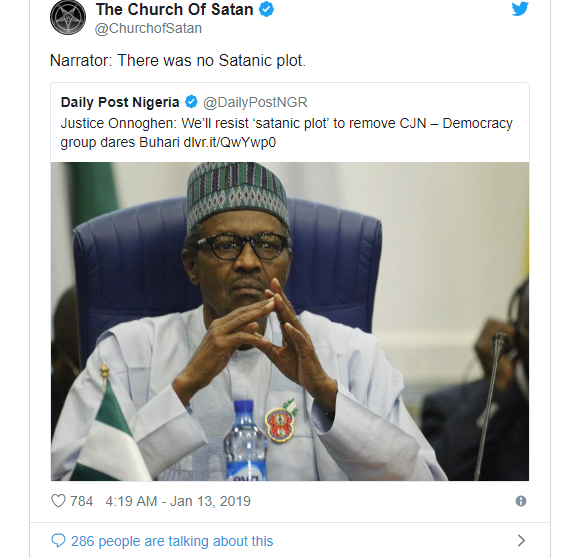 Following the trial of Chief Justice Walter Innoghen which has now seen the case being adjourned,the Church of Satan has reacted a claim that there is a satanic Plot to remove Onnoghen Walter as the Chief Justice of Nigeria.