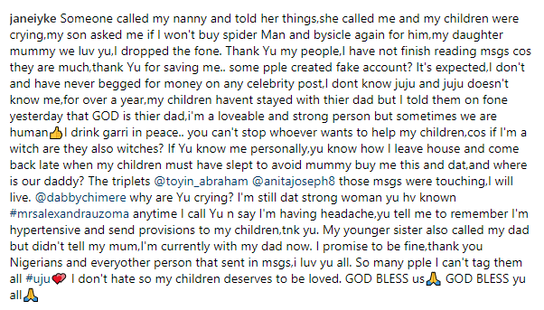 Someone called my nanny and told her things,she called me and my children were crying,my son asked me if I won’t buy spider Man and bysicle again for him,my daughter mummy we luv yu,I dropped the fone. Thank Yu my people,I have not finish reading msgs cos they are much,thank Yu for saving me.. some pple created fake account? It’s expected,I don’t and have never begged for money on any celebrity post,I dont know juju and juju doesn’t know me,for over a year,my children havent stayed with thier dad but I told them on fone yesterday that GOD is thier dad,i’m a loveable and strong person but sometimes we are human. I drink garri in peace.. you can’t stop whoever wants to help my children,cos if I’m a witch are they also witches? If Yu know me personally,yu know how I leave house and come back late when my children must have slept to avoid mummy buy me this and dat,and where is our daddy? The triplets @toyin_abraham @anitajoseph8those msgs were touching,I will live. @dabbychimere why are Yu crying? I’m still dat strong woman yu hv known #mrsalexandrauzoma anytime I call Yu n say I’m having headache,yu tell me to remember I’m hypertensive and send provisions to my children,tnk yu. My younger sister also called my dad but didn’t tell my mum,I’m currently with my dad now. I promise to be fine,thank you Nigerians and everyother person that sent in msgs,i luv yu all. So many pple I can’t tag them all #uju? I don’t hate so my children deserves to be loved. GOD BLESS us? GOD BLESS yu all?