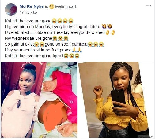 According to a friend and Facebook user who goes by the name Mo Re Nyke,the young lady had given birth on Monday and had celebrated her birthday on Tuesday, but by Wednesday, she had died.