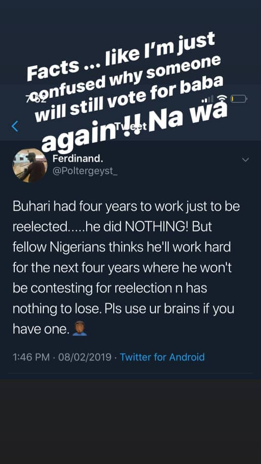 According to him, he doesn’t understand why anyone would want to vote Buhari in again.