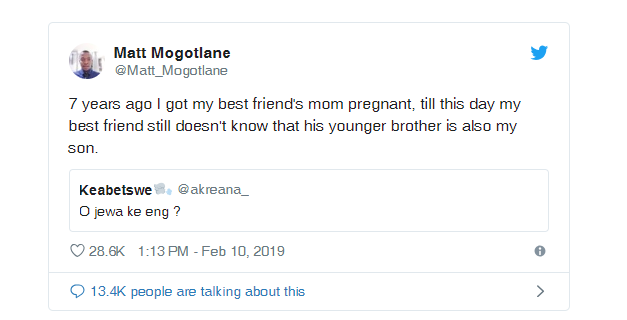 A social media user by the named Matt Mogotlane has taken to Twitter to reveal that his friend’s younger brother is actually his song.