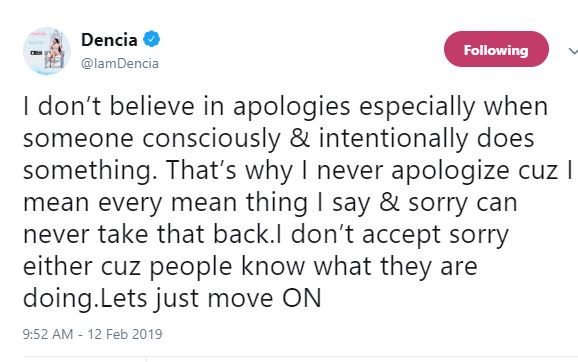 Singer Dencia is letting the world know she does not believe in apology.