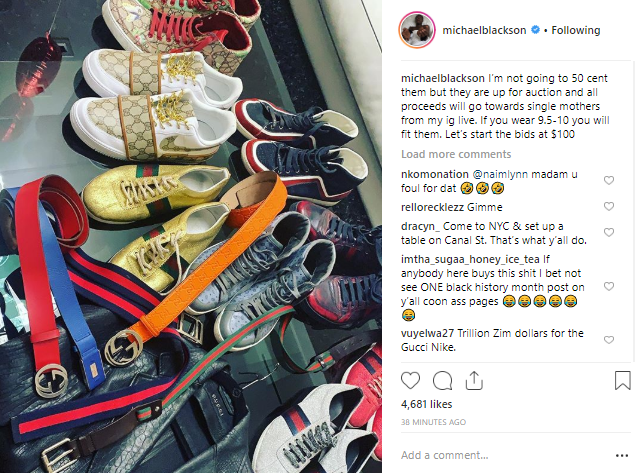 ”I’m not going to 50 cent them but they are up for auction and all proceeds will go towards single mothers from my ig live. If you wear 9.5-10 you will fit them. Let’s start the bids at $100.”