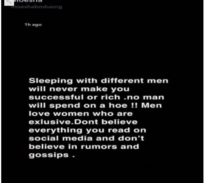 Sleeping with different men will never make you successful or rich. no man will spend on a hoe!! Men love women who are exclusive. Don’t believe everything you read on social media and don’t believe in rumours and gossips.
