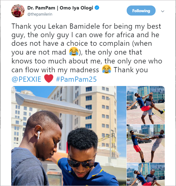 ‘Thank you Lekan Bamidele for being my best guy, the only guy I can owe for africa and he does not have a choice to complain (when you are not mad ?), the only one that knows too much about me, the only one who can flow with my madness ? Thank you @PEXXIE ??’