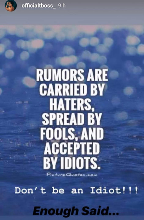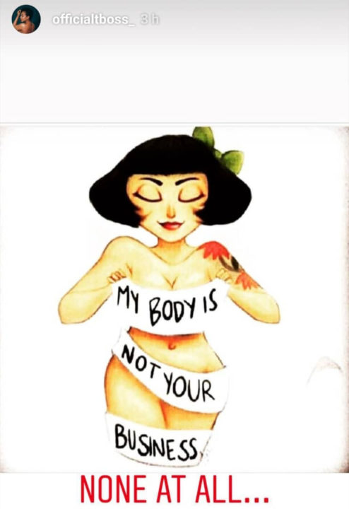 Slamming the pregnancy rumours, Tboss asked that people mind their own business, as her body is not up for anyone’s discussion.
