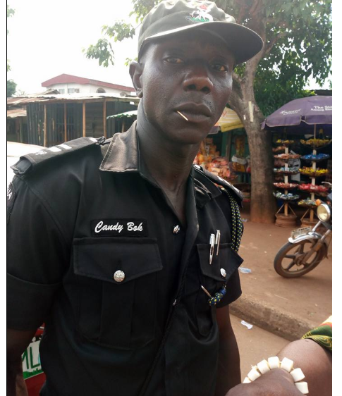…And this is a police officer operating along Obilubi by Capitol junction ( Orji road to Ikeduru) with name Candy Bole as seen on his name crest.